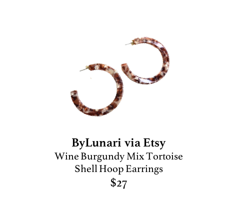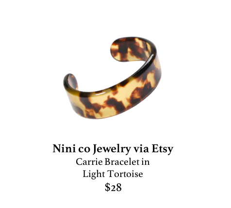 Lastly, I searched for some light faux tortoise accessories in Etsy to compliment the outfit, the pattern particularly inspired by the Estimon bag. I found this cellulose acetate bracelet. Both the bracelet and the earrings are made by artisans, who are always good to support.